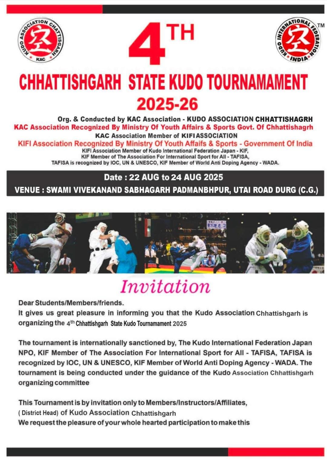 4 th kudo state tournament coming on 22 august to 24 agust 2025-26 at durg
